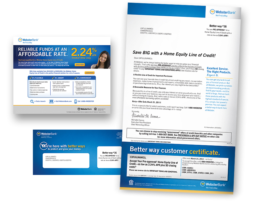 A whimsically branded envelope invites the account holder inside to learn more about a great low-rate offer. The yellow house graphic around the second window cleverly highlights the rate from the outside and plays well with the energetic teaser copy. A QR code on the back invites account holders to enjoy a positive brand experience with Webster’s blog.